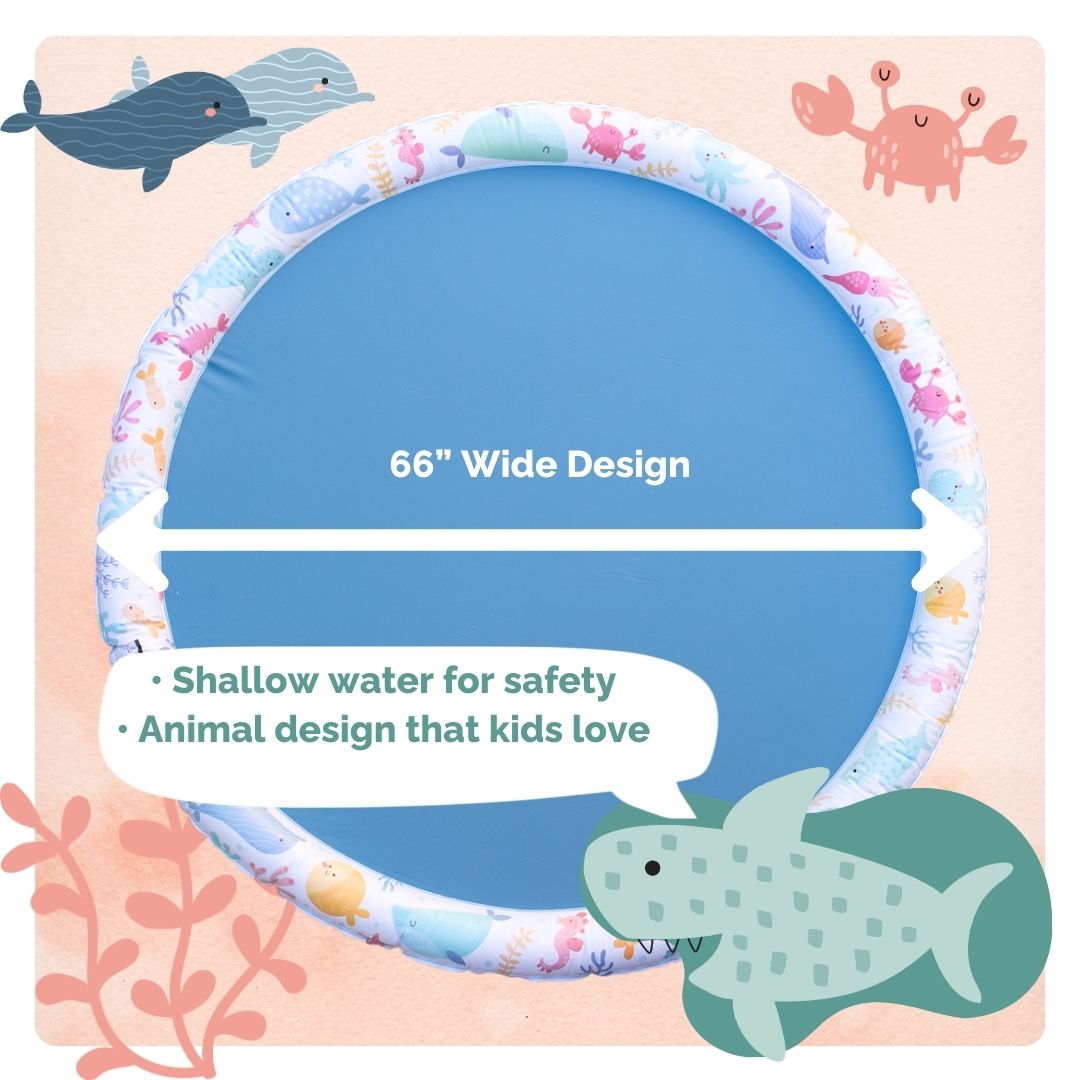 Designed with safety and fun in mind, our splash pad is made from durable, safety tested materials, ensuring endless hours of entertainment for kids. Simply attach it to any standard garden hose and watch as the water sprays, creating a magical play area for your children to enjoy. With its sea animal design, our splash pad will captivate and engage your little adventurers. Let their imaginations run wild as they splash, jump, and play in the gentle spray of water. But that's not all - our splash pad is not only a source of entertainment but also a valuable tool for sensory development and gross motor skills. As they navigate through the water and wade in the pool, children will enhance their coordination and balance, all while staying cool and refreshed.